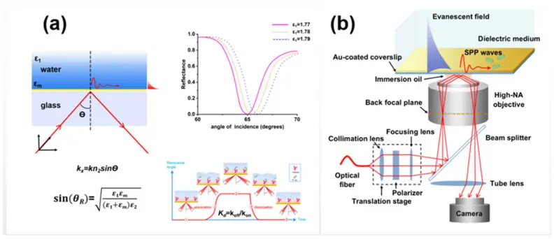 Figure:Schematic diagrams of (a) SPR optical system and (b) SPR microscopy.