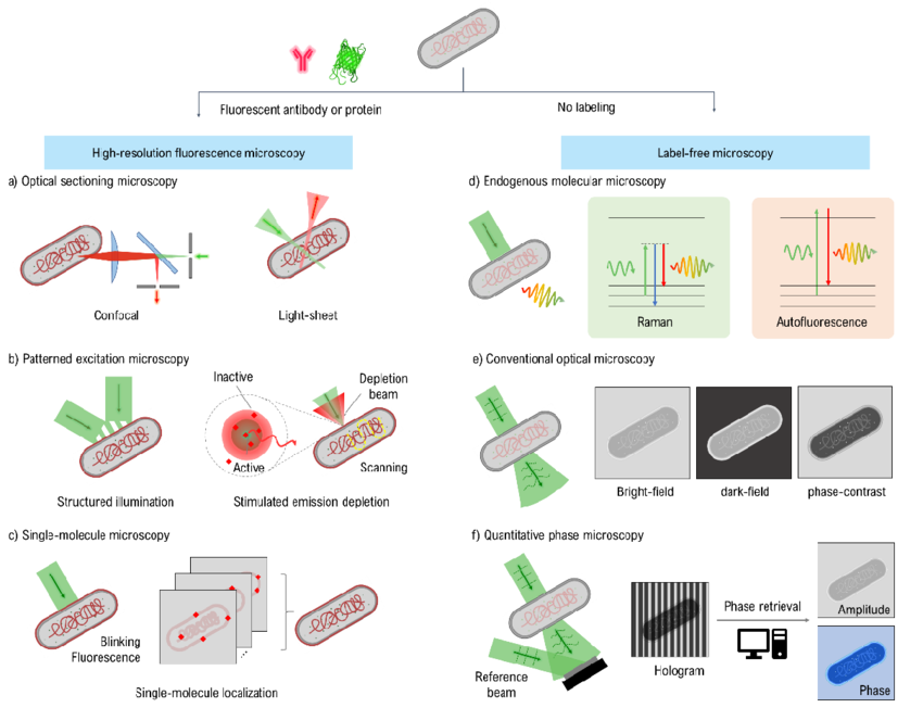 Figure: Schematic diagrams of high-resolution microscopy techniques are categorized based on their dependence on bacterial sample labeling.